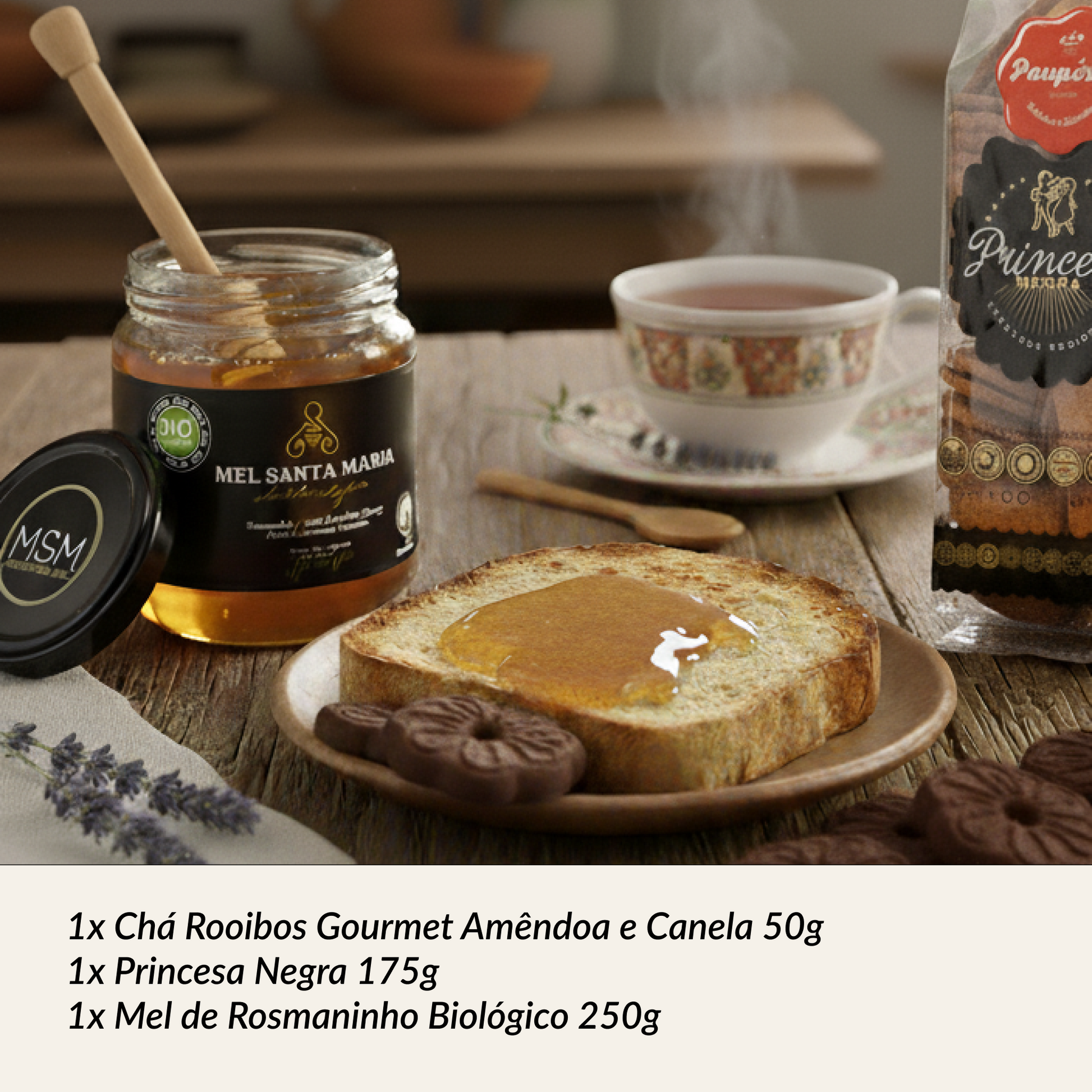 Desperte os seus sentidos para a autenticidade e o sabor genuíno de Portugal com a nossa coleção "Pequenos Prazeres Rurais". Cada manhã merece ser celebrada com a riqueza da natureza e a doçura da tradição. Reúna à sua mesa o nosso requintado Mel Santa Maria, um mel biológico de Rosmaninho e Lavanda Marítima, colhido nos corações de Trás-os-Montes, e combine-o com as inconfundíveis Bolachas Princesa Negra da Paupério, Tesouros Regionais de Valongo, conhecidas pelo seu sabor intenso a cacau.