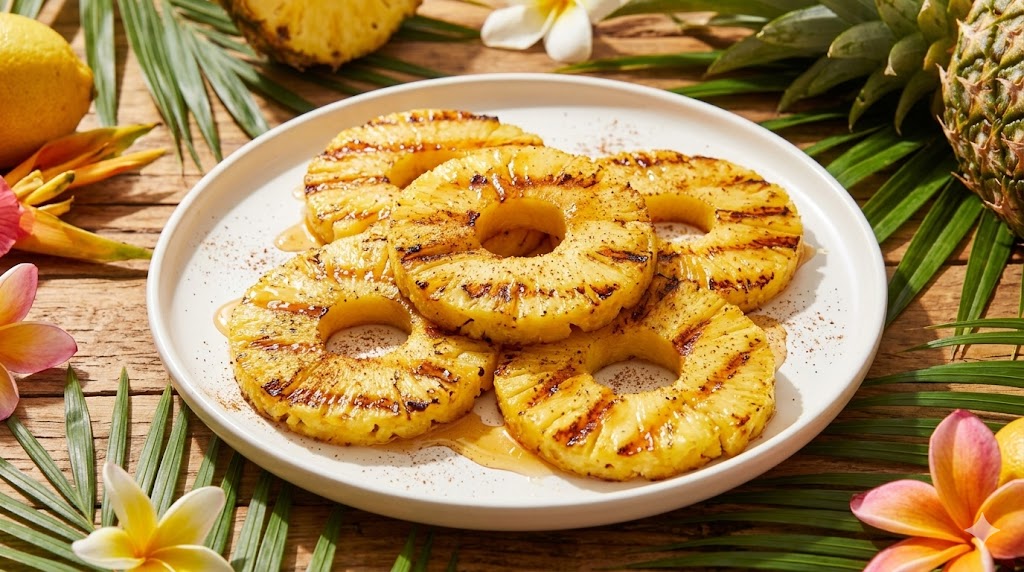 Ver receita originalRodelas de ananás fresco grelhadas com açúcar e canela, regadas com mel. Uma sobremesa tropical e refrescante feita na brasa do churrasco.