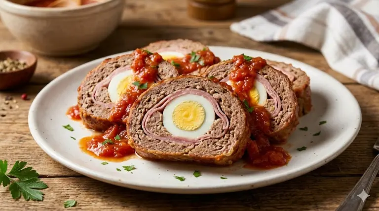 Ver receita originalRolo de carne picada recheado com fiambre e ovo cozido, assado no forno com molho de tomate — uma receita clássica que agrada a toda a família.